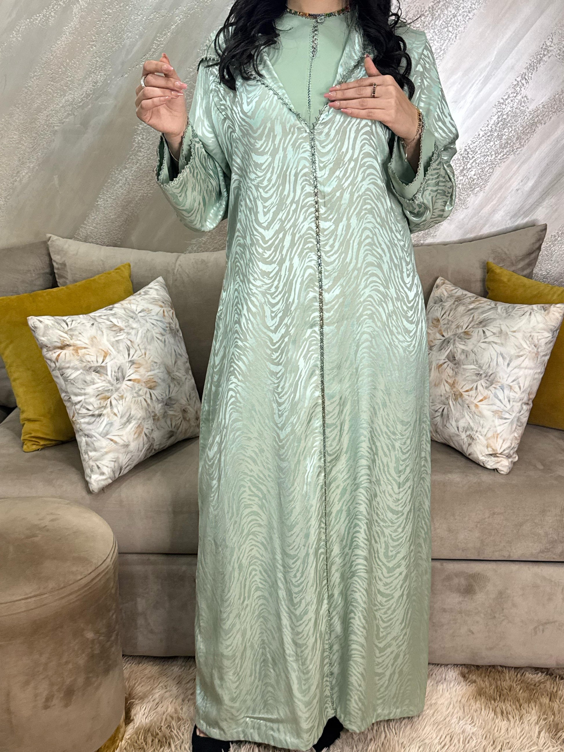 Elegante mintgroene 2 delige jelleba van hoogwaardige kamkha stof, verfijnd afgewerkt met traditionele randa-details. Perfect voor een chique en frisse look voor elke gelegenheid.