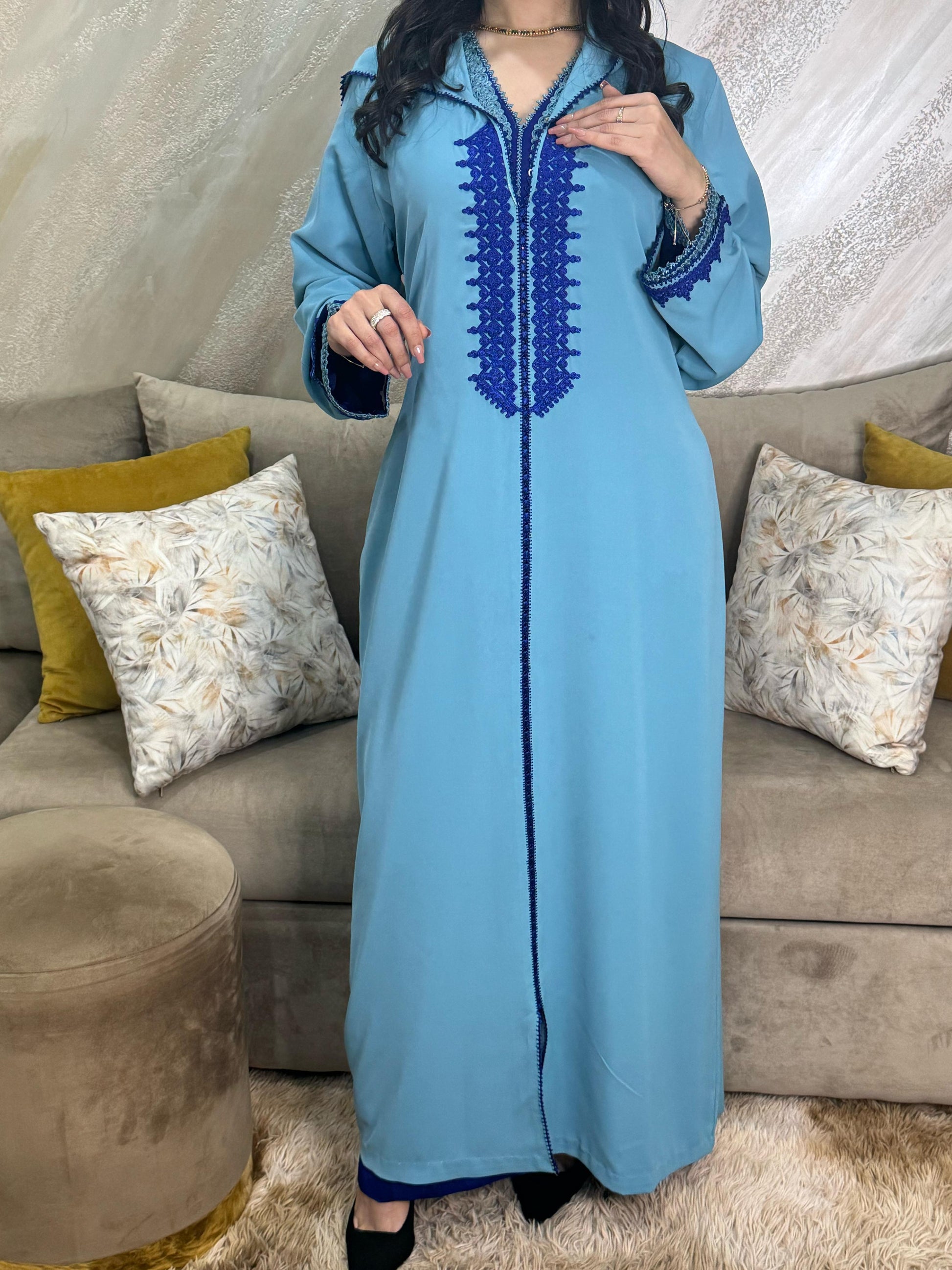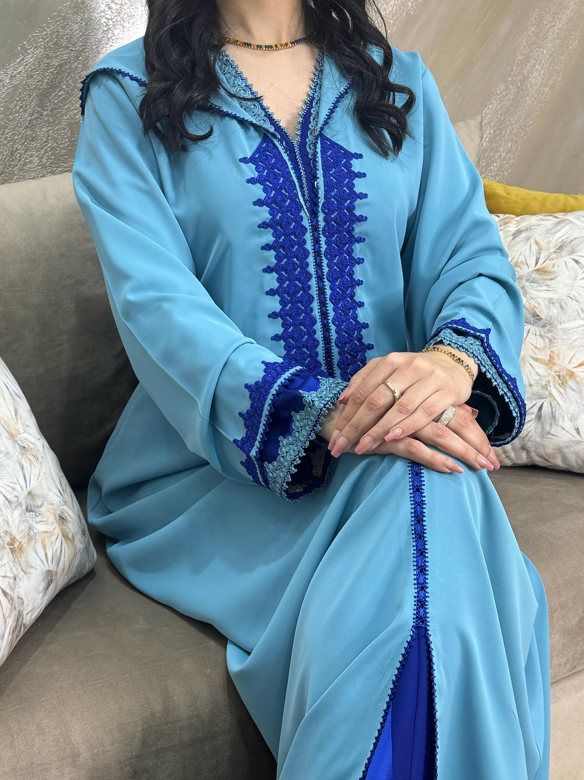 Een verfijnde lichtblauwe jellaba Noor van soepele crêpestof, gecombineerd met een bijpassende blauwe onderjurk van glanzende jawhara stof. Beide stukken zijn afgewerkt met elegante tarz-details, wat zorgt voor een chique en tijdloze uitstraling.