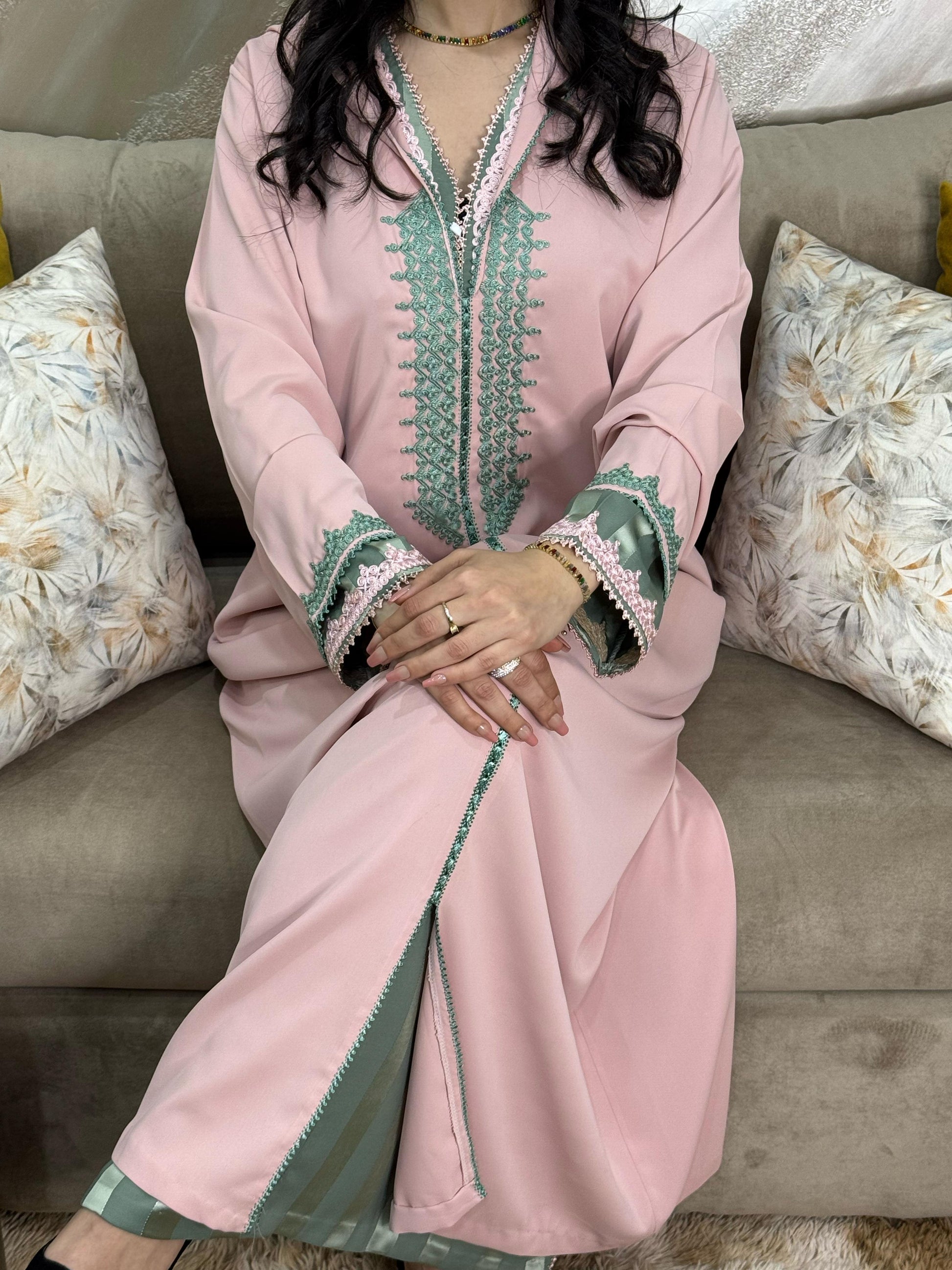 Een charamante roze jelleba met verfijnde groene tarz, perfect afgestemd op de bijpassende groene jawhara
