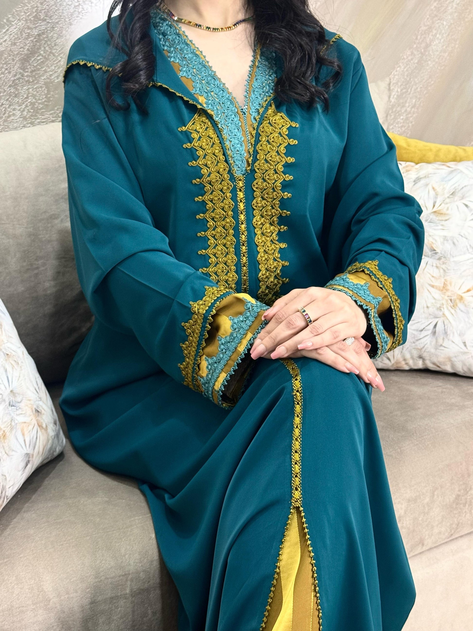 Groene 2delige jelleba Noor met bijpassende onderjurk Jawhara in de kleur moutard - een elegante, traditionele outfit met moderne flair. De jelleba is verfijnd afgewerkt en comfortabel, perfect voor zowel alledaags gebruik als gelegenheden.