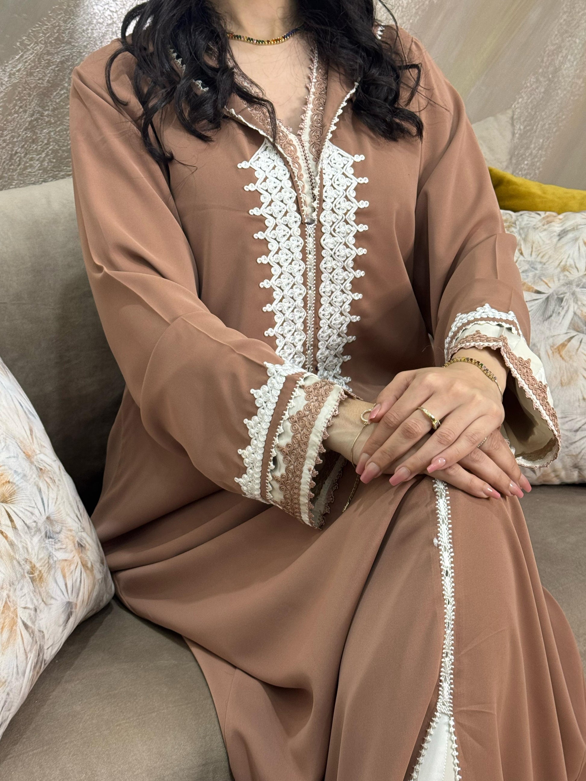 Elegante jelleba in crêpe met stijlovolle tarz, gecombineerd met een bijpassende onderjurk can glanzende jawhara-stof. Een verfijnde set met traditionele touch.