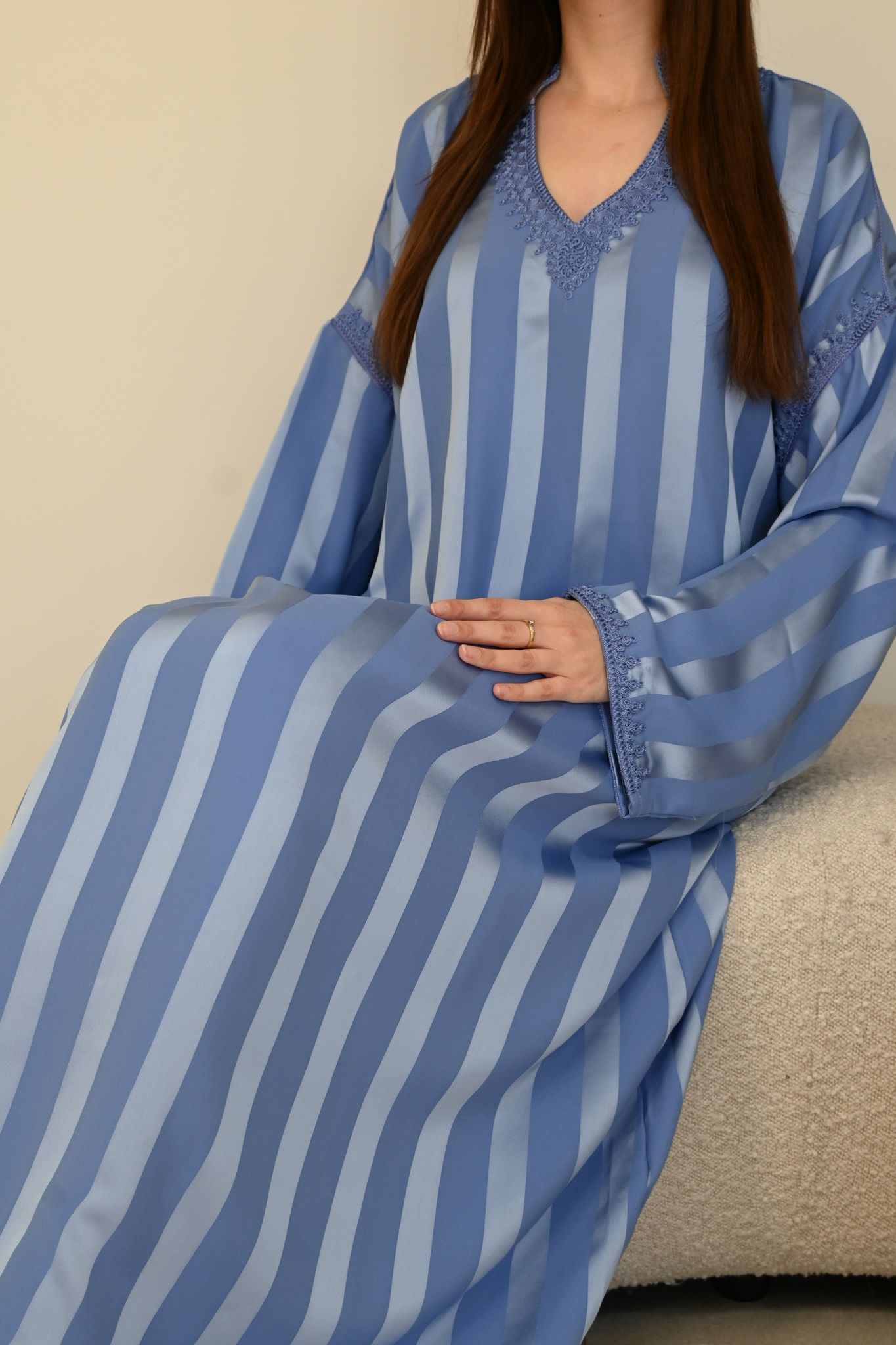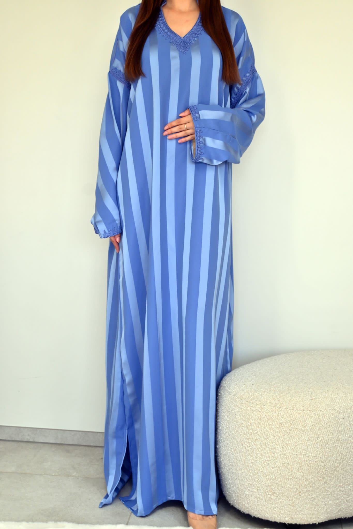 Luxe hemelsblauwe jawhara kaftan met een elegante tarz aan de kraag en mouwen. Een chique en tijdloze keuze voor elke gelegenheid.