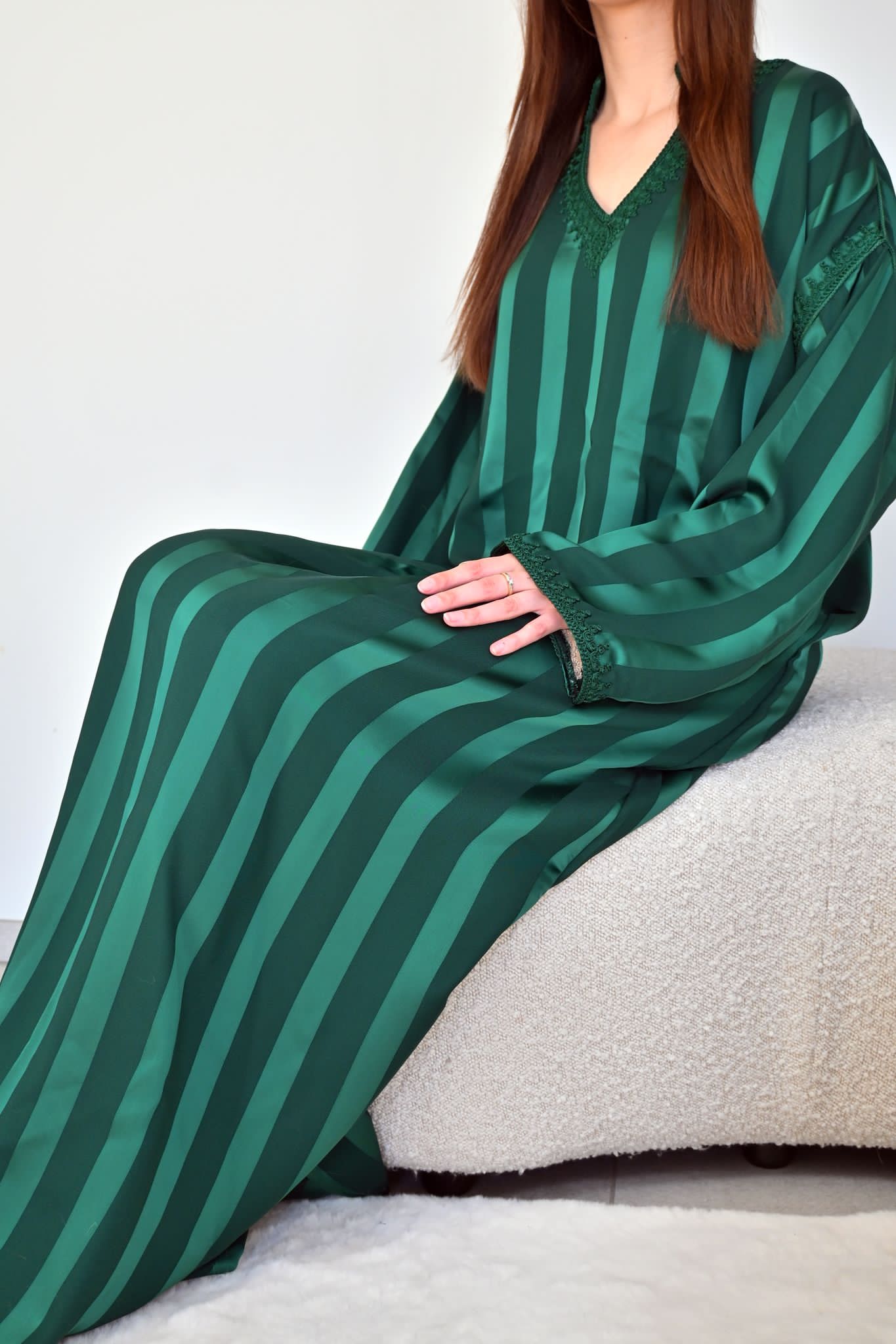 Luxe royal groene jawhara kaftan met een elegante tarz aan de kraag en mouwen. Een chique en tijdloze keuze voor elke gelegenheid.