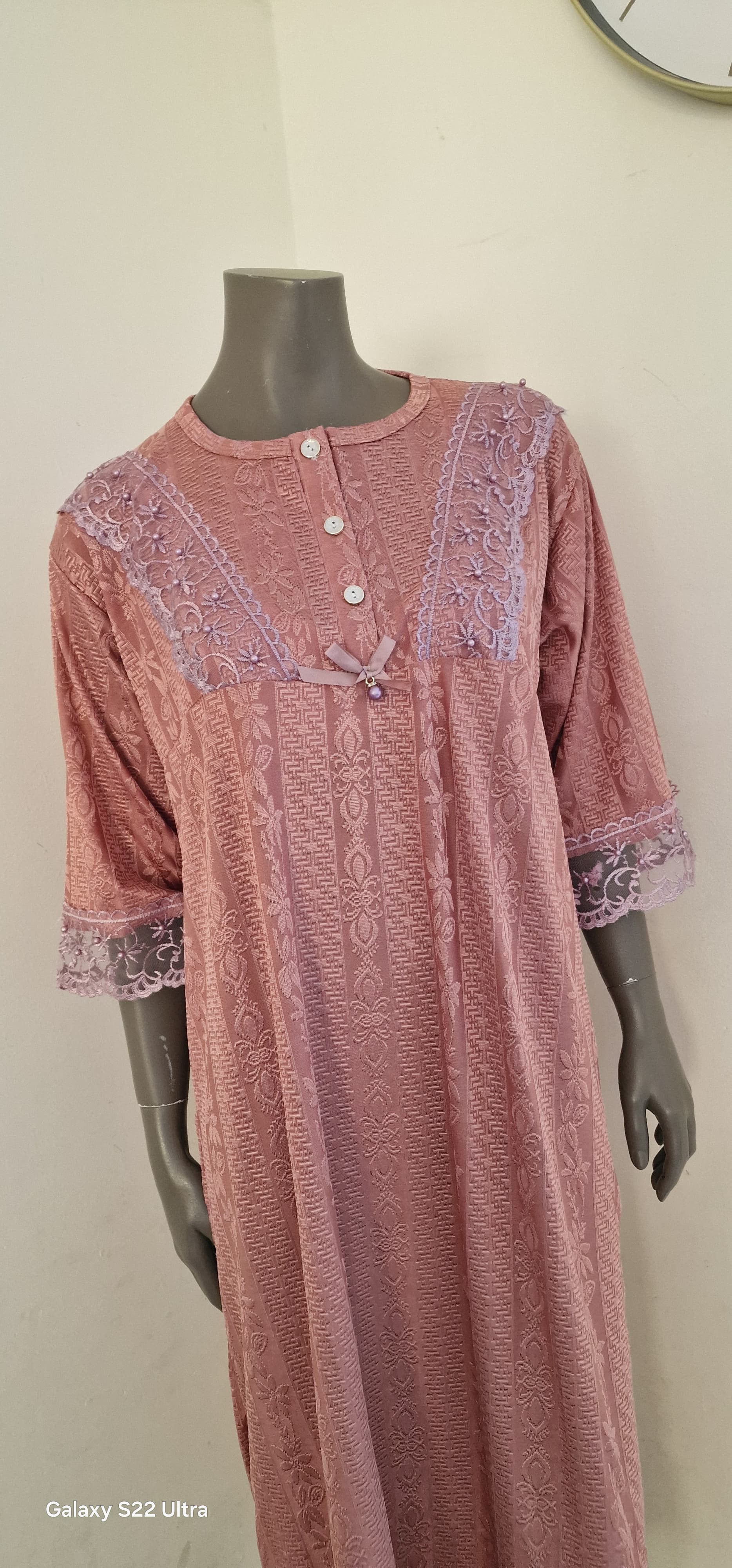 Ervaar ultiem comfort en elegantie met dit stijlvolle nachthemd, perfect voor ontspannen avonden en rustige nachten. Gemaakt van een zachte, glanzende stof met een subtiel zigzagpatroon, straalt dit huisjurk vrouwelijkheid en luxe uit.