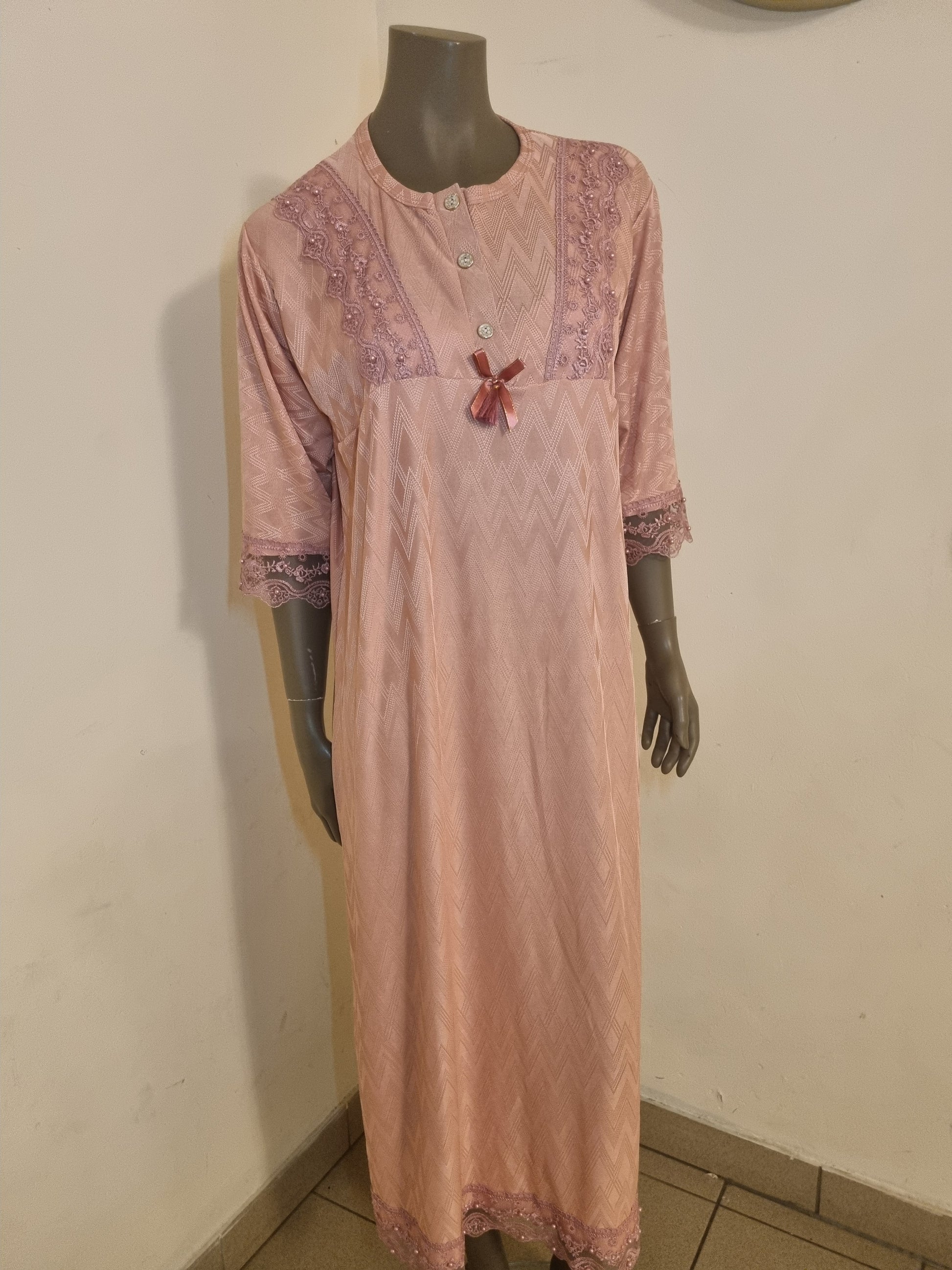 Ervaar ultiem comfort en elegantie met dit stijlvolle nachthemd, perfect voor ontspannen avonden en rustige nachten. Gemaakt van een zachte, glanzende stof met een subtiel zigzagpatroon, straalt dit huisjurk vrouwelijkheid en luxe uit.