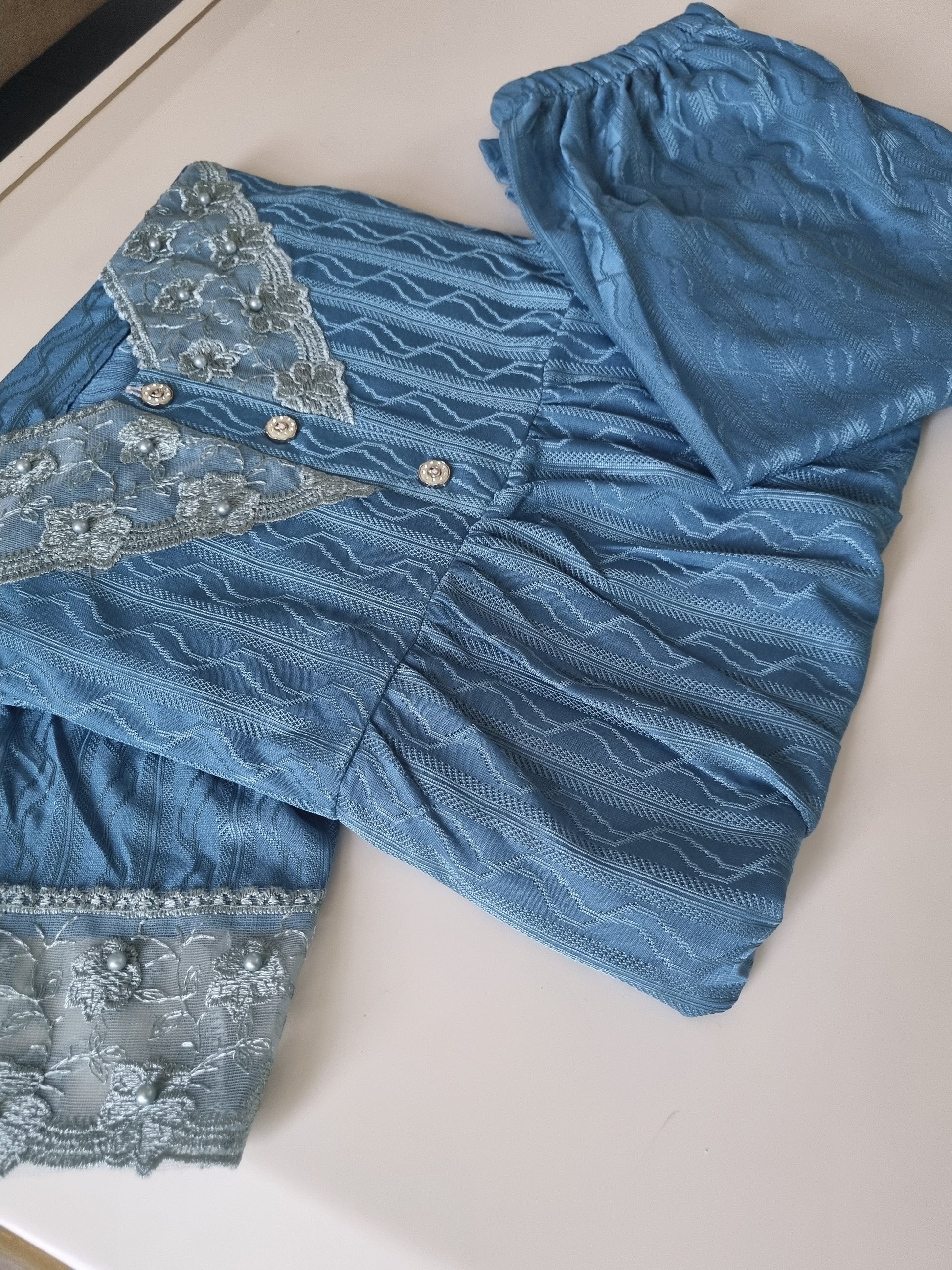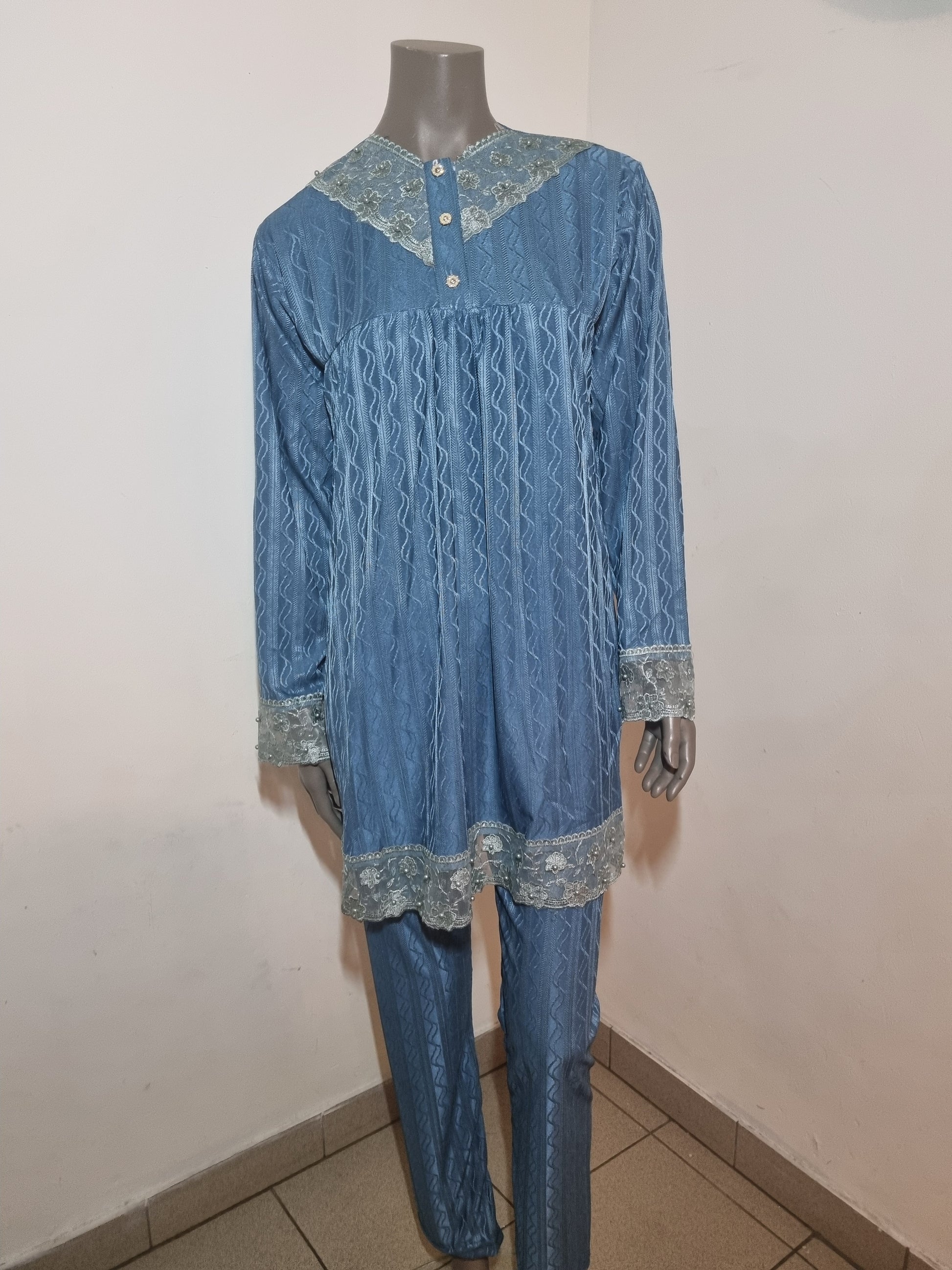 Luxe huispak bewerkt met kant. Zowel aan mouwen als aan de onderkant van de bloes.