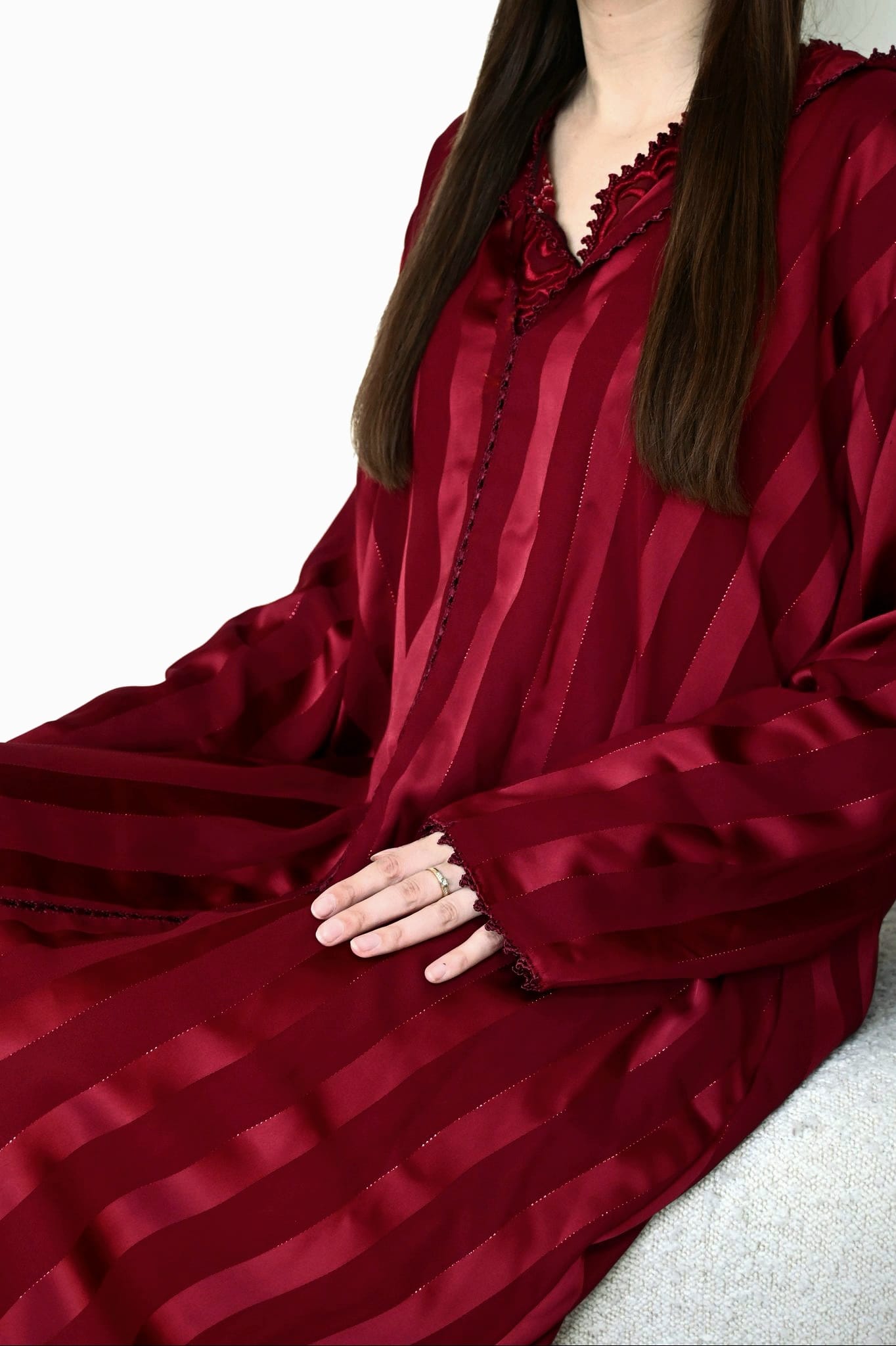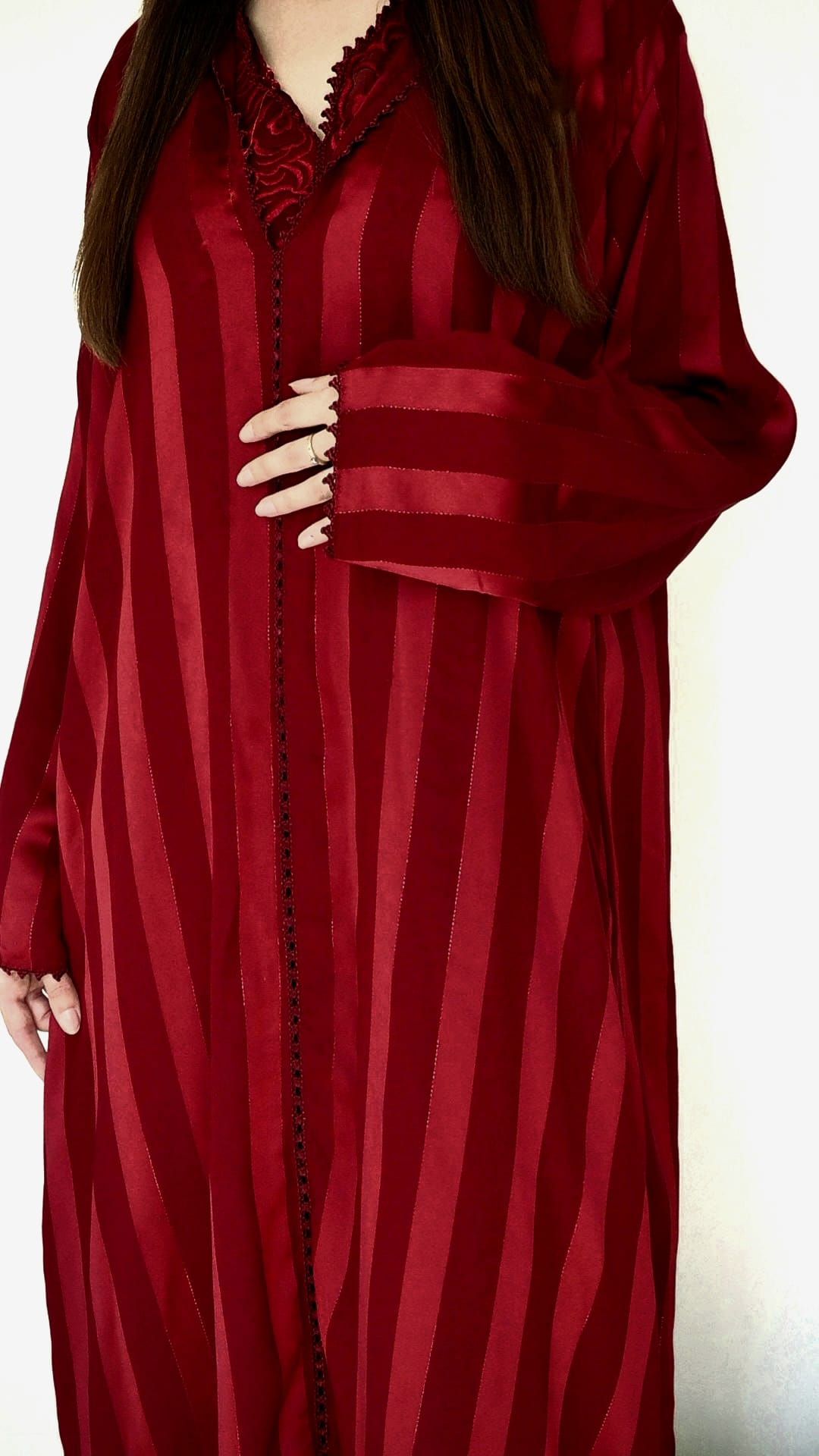 Elegante 2 delige set bestaand uit een jawhara jelleba afgewerkt met randa en tarz, en een bijpassende sousdi onderjurk met subtiele tarz detail. Stijlvol, verfijnd en perfect voor speciale gelegenheden.