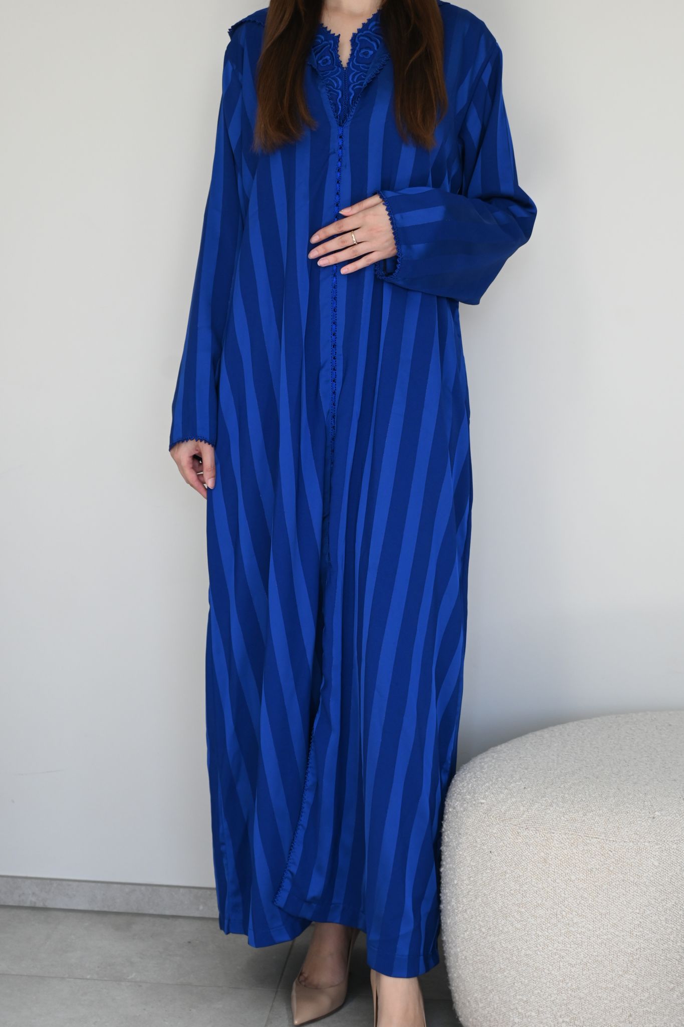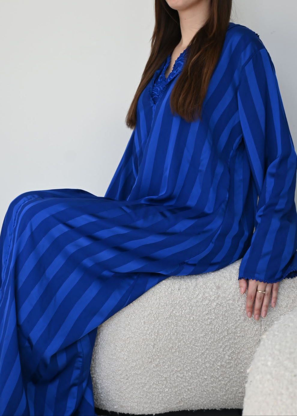 Elegante 2 delige royal blauwe set bestaand uit een jawhara jelleba afgewerkt met randa en tarz, en een bijpassende sousdi onderjurk met subtiele tarz detail. Stijlvol, verfijnd en perfect voor speciale gelegenheden.